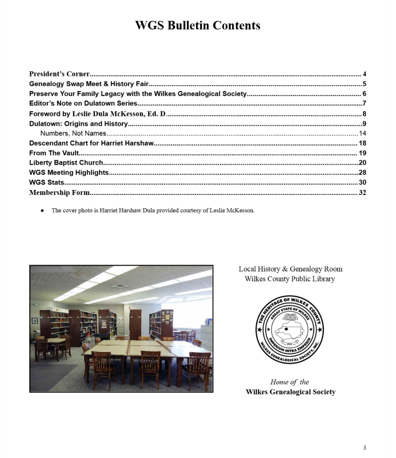 The bulletin is available for paying members to read and download, and a free copy is accessible in the Local History & Genealogy Room at the Wilkes County Public Library—home of the Wilkes Genealogical Society.